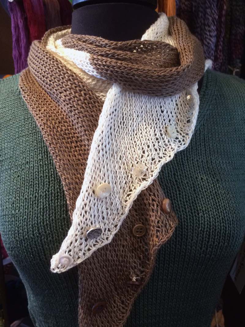 Fast and easy! A simple bias knit scarf in two colors, finished with buttons. Knit in Katia Lino, this 100% linen scarf will look odd shaped and feel stiff while knitting, but washing and blocking brings out the beauty. Adding buttons or beads to the edges provides a bit of weight that helps it hang perfectly. So many different ways to wear this! Knit with two 50 gram balls Katia Lino, in contrasting colors. Colors shown are #3 off white and #17 dark taupe.