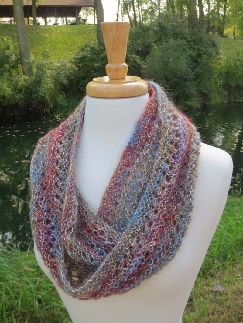 This fabulous cowl can be worn long or doubled for a warm, yet chic look. The soft sparkle and subtle stripe in the yarn give this cowl a sophisticated yet casual look. The lacy pattern gives texture and complexity to the cowl, while still being easy enough for a beginner. A single skein of Uluru is enough for two cowls. Or you can add additional pattern rows to increase the width. How clever is that?