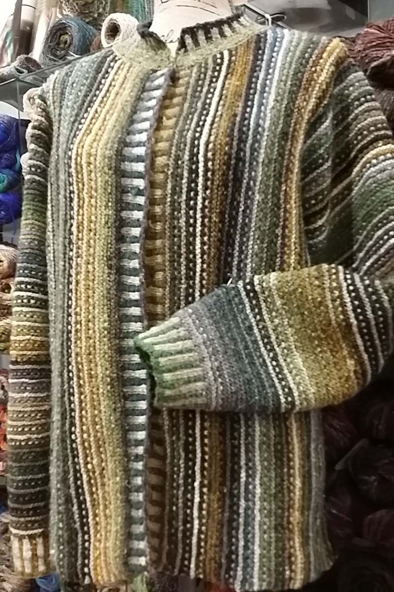 This cardigan uses a slip stitch to make these flattering "stripes" in only 2 colors of Noro's silk garden sock. One color at a time for the body. The ribbing is knit in fair isle style with both colors alternating in the knit row. It's a great way to get your feet wet with fair isle and rewarding to see the colors work up with the garter based slip stitch.