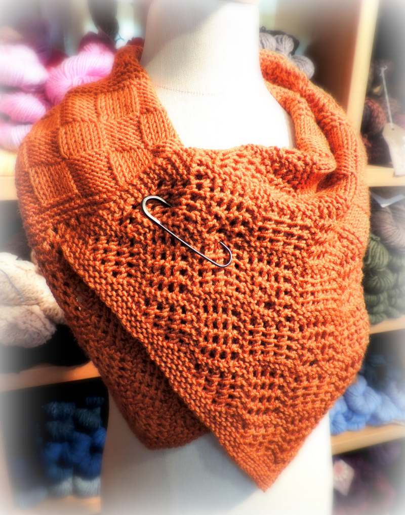 This short scarf, alternates a simple checkerboard lace with a solid checkerboard pattern. It is the perfect little scarf to wear as an ascot, and knits up quickly. Two lace options are offered—one very textural and reversible, the other smooth and crisp…cowl option, as well!