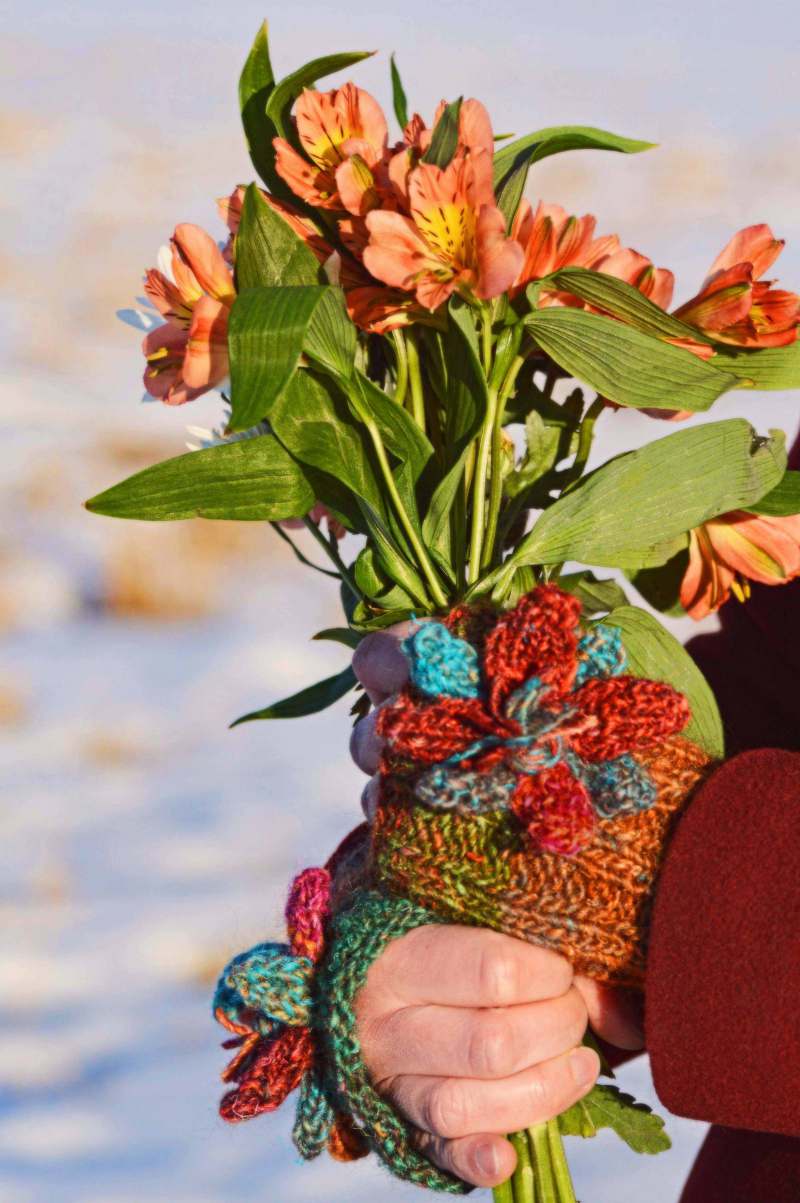 The flowers may not be out, but you can knit your own to satisfy your craving for them. Put them on little mitts to keep your fingers warm while the snow melts, or, later, in your air-conditioned office.