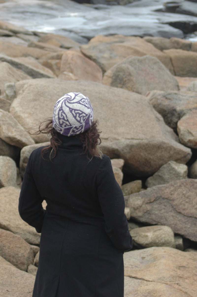 This hat is a simple application of decorative increasing and decreasing in double-knitting. Six banners or flags in 3 different Celtic knot motifs run diagonally around this hat and up to a spiral at the crown.