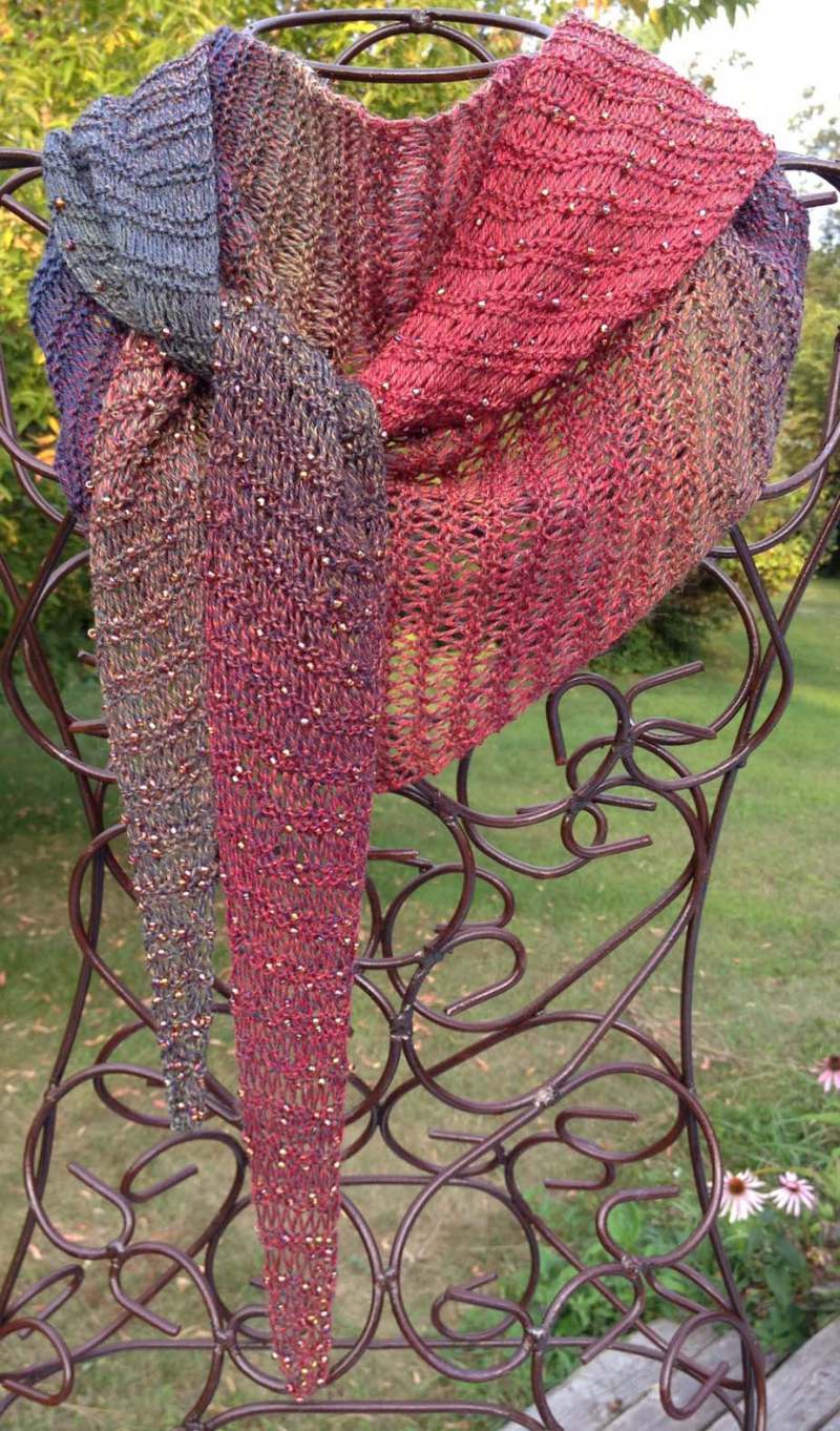 The wrap will vary in length and depth, depending on yarn and needle choices. Optional bead placement instructions are written in the pattern.