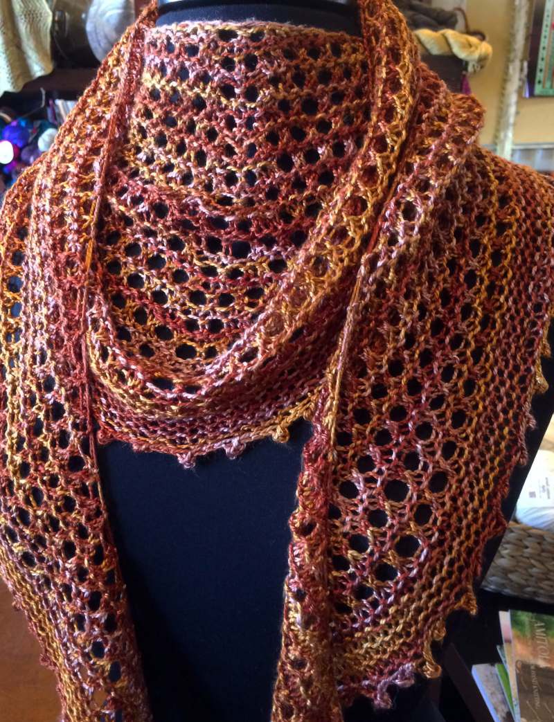 This sweet crescent shaped scarf was designed to show off the variegated colors of KFI Luxury Silk Sport yarn. Just one hank of pure mulberry silk, a simple eyelet pattern, and absolutely no purls make this a fast and easy lace project. Finish with a picot bind off and wet blocking to open up the lace pattern, and the end result will be dramatic and luxurious!