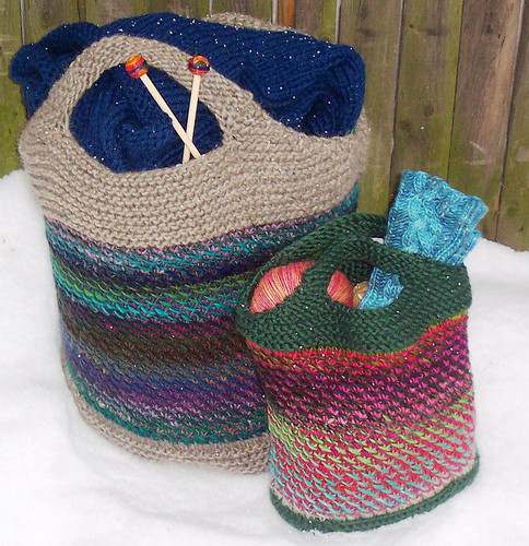 This pattern uses a special stitch to overlay one color of Noro on top of another giving the impression of looking through a net to see a gorgeous sunset. The bottom and handles are made from Debbie Bliss Roma, knit fairly tight to create a sturdy and beautiful bag. The smaller bag is a great purse size tote and the large bag can be the knitting bag you’ve been waiiting for….big enough to carry a sweater!