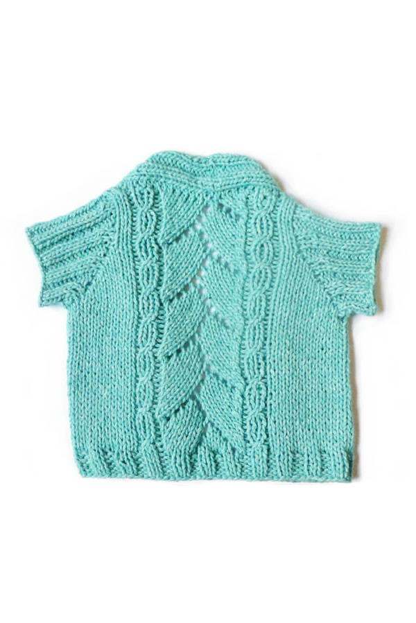 The Kanti Baby Cardi is knit seamlessly from the top down. It begins with a provisional cast-on at the back of the collar. The left collar is knit, stitches are cast-on for the left shoulder then the left front is knit to the bottom of the armhole. Left front stitches are put onto a holder. Provisional cast-on stitches are returned to needle and the right collar and front are knit then put onto a holder. Stitches are picked up along each shoulder and along the selvedge edge of the back collar, and the back is knit to the bottom of the armholes. The fronts and back are all placed onto the needle and worked together for the body. Sleeve stitches are picked up around each armhole edge. The sleeve caps are shaped with short rows in k2, p2 ribbing, then the sleeve is worked in the round.