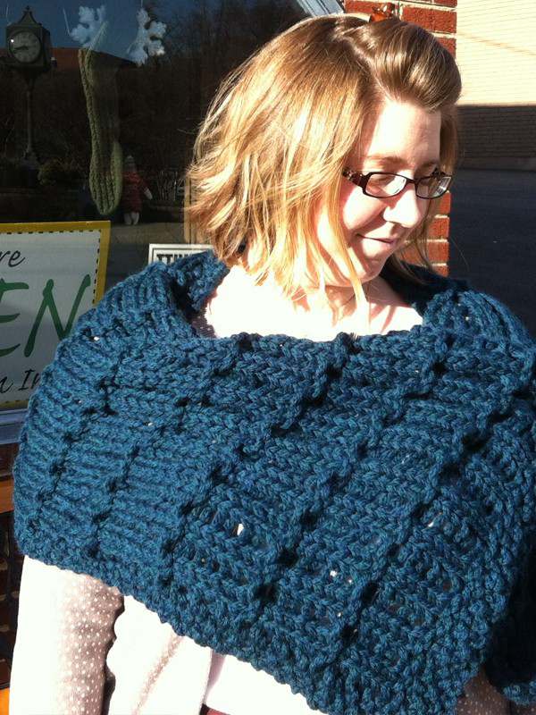 The shawl was designed to be simple and fun to knit, large enough to be warm, and soft enough to be snuggly. The dropped stitches accentuate the loft of the yarn and add to it’s “cuddly” factor.