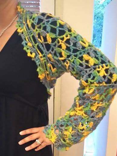 Shrug is crocheted with Araucania Puelo Baby Llama. This super soft colourful yarn along with the lacy design pattern creates a shrug that can be worn for any occasion. Shrug is worked in one piece and then finished with a lacy edge pattern.