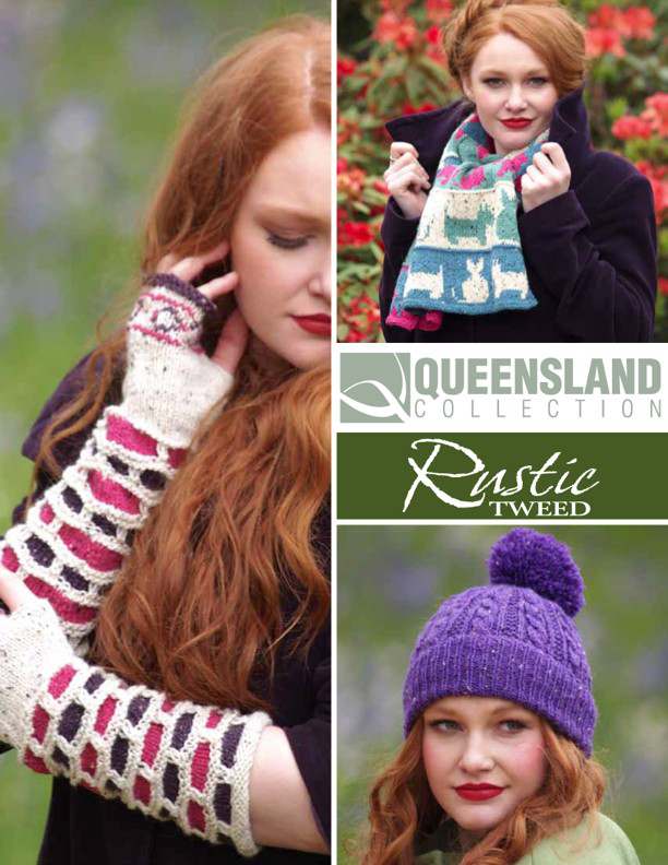 This design is featured in Rustic Tweed - Hat, Wristwarmers & Scarf, a leaflet from Queensland, and uses Queensland yarn including Rustic Tweed