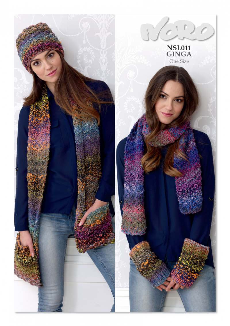 This design is featured in Ginga - Hat, Scarf with or without pockets & Wristwarmers, a leaflet from Noro, and uses Noro yarn including Ginga