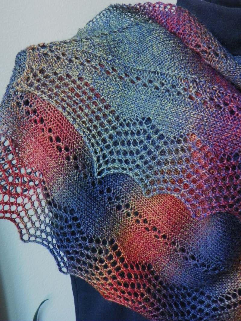 Some things are just too easy to be true. But not in this case! Grab yourself some colorway yarn and let it do the majority of the fancy work. I used exactly 2 skeins of Knitting Fever Painted Desert which gave me the perfect halfway point, time to reverse the shaping. Simplicity of stitches add another layer of ease, K2tog and Yo's are the backbone of this pattern. And blocking.....never done so quick! The slipped stitch garter edge leaves an open pattern to weave wires in and out. Anchor these and then pin out the points. DONE!!! Shaping is all worked on the left side of stockinette area, and can easily be adjusted if wanted. Get your yarn, #4, 3.50 needles and 4 stitch markers and be on your way. My patterns are all written entirely in both row by row instructions and charts. Enjoy!