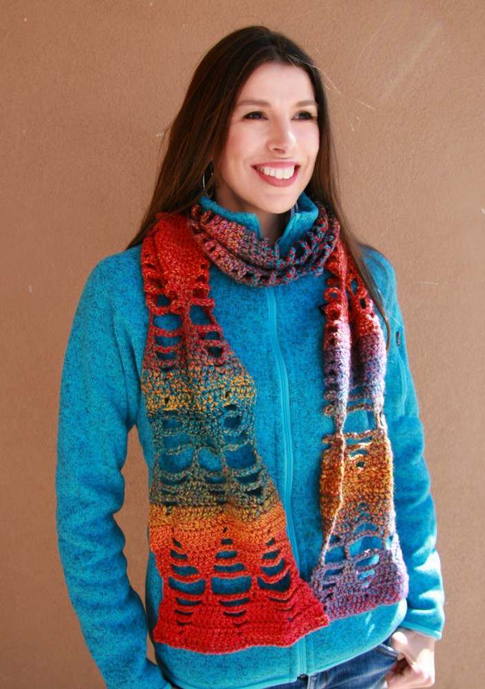 The Ayo Scarf is crocheted in a large scale lace pattern which flows from solid to open-work diamond motifs. Self-striping yarn adds an element of color to the dynamic geometric shapes. Careful blocking creates subtle waves along the side edges. Whether worn with jeans and a turtleneck or over a hip leather jacket, this versatile accessory will add interest to any Fall or Winter outfit.