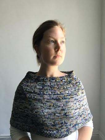 Knit from the top down, the cowl increases in dimension, within the pattern, to become a capelet.