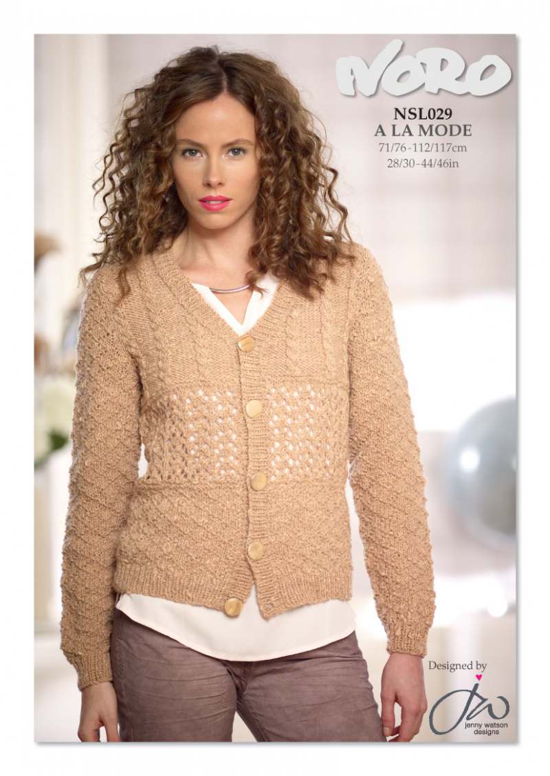 This design is featured in A La Mode - Cardigan with Lace, Texture and Cables, a leaflet from Noro, and uses Noro yarn including A La Mode