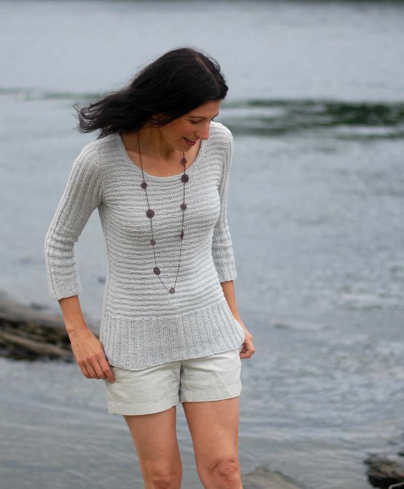 Worked in one piece from the shoulders-down and almost entirely in the round, the 2x2 ribbing on the back and sleeves contrasts with double garter st on the front. The set-in sleeves are created seamlessly with the upper bodice in a technique originally described by Barbara Walker (photo tutorial included).