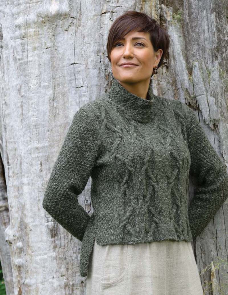 Here's a comfy sweater that's mostly easy knitting – moss stitch, but with a limited amount of challenge – the cable panel on the front. I've updated the classical shape by making the back longer than the front and leaving the sides open at the bottom.