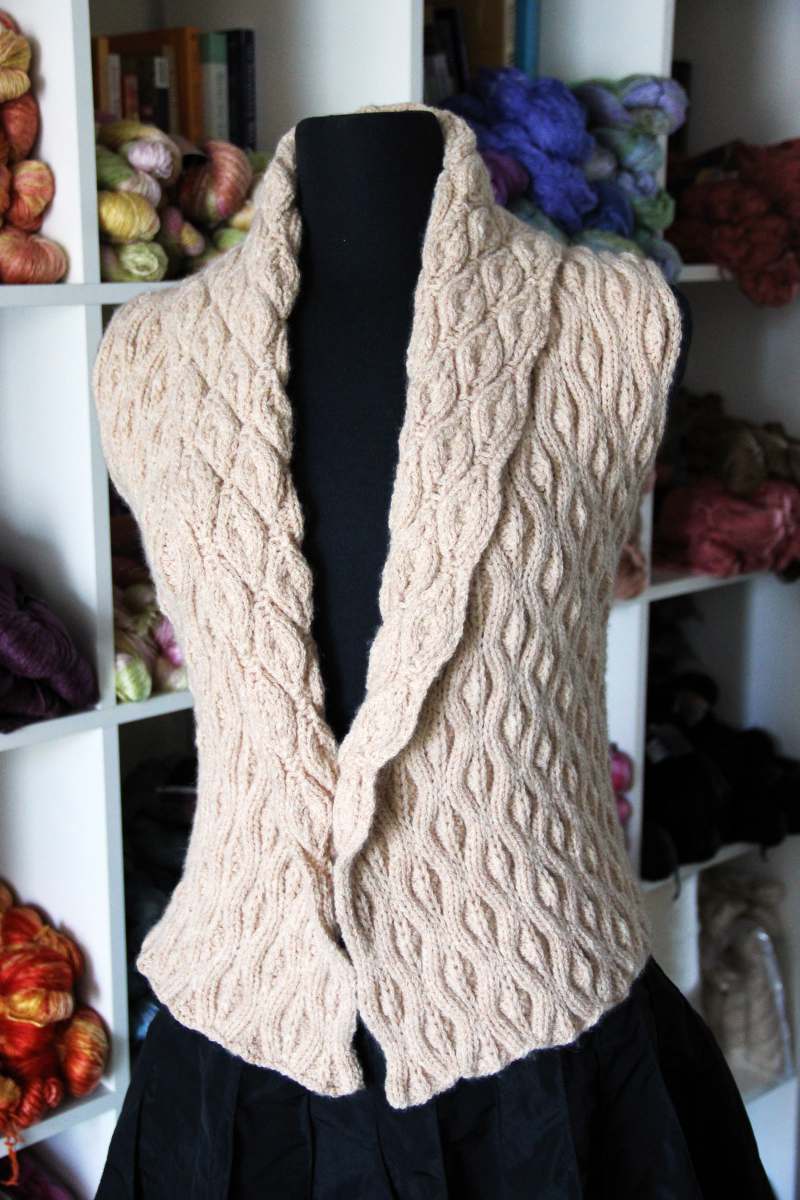 This vest is worked in two pieces and has an unusual construction. The stitch pattern is reversible allowing the knitter to choose which side they would like to feature! The fabric is quite stretchy since it is actually a complicated rib stitch pattern.