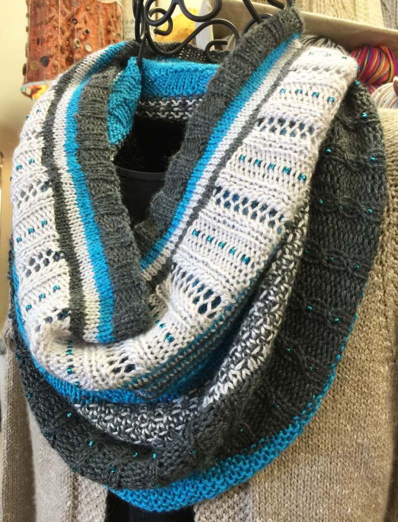 I've been teaching bead knitting classes for a few years, and have been asked about other ways they may be applied in knitting. This cowl is a stitch sampler of eight different pattern sections, using three colors of yarn, as well as demonstrating three different ways to incorporate pre strung beads in a knitted piece. I hope it makes you happy, too!