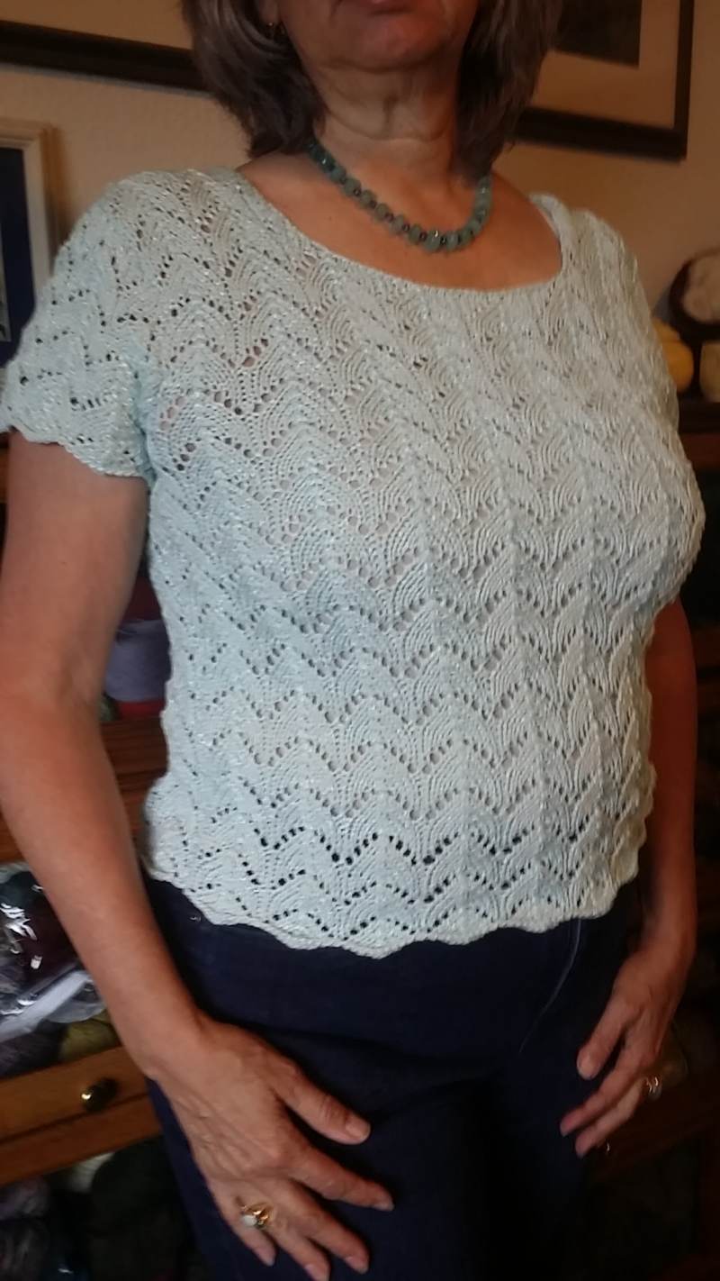 This lovely spring bamboo top is knit with the mermaid tail lace stitch. It has a wonderful fit and is airy and light.