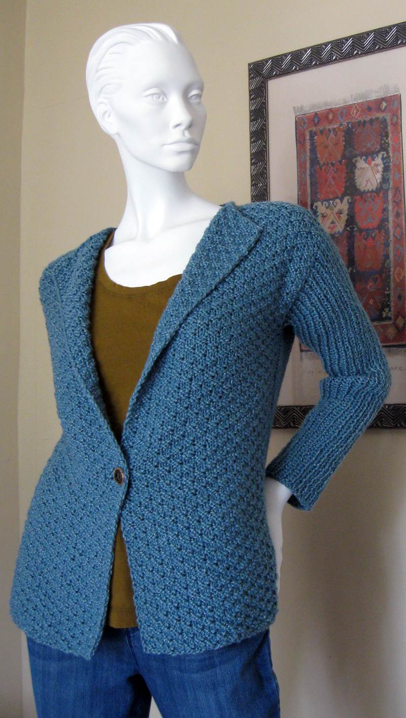 The back and fronts are worked separately, the fronts in Box stitch and the back in stockinette with a lower border of Box stitch. There’s some simple shaping on the back to give the waist a bit of fit for a more flattering cardigan. The shoulders are shaped using short-rows, then joined using Three-Needle Bind-Off.
