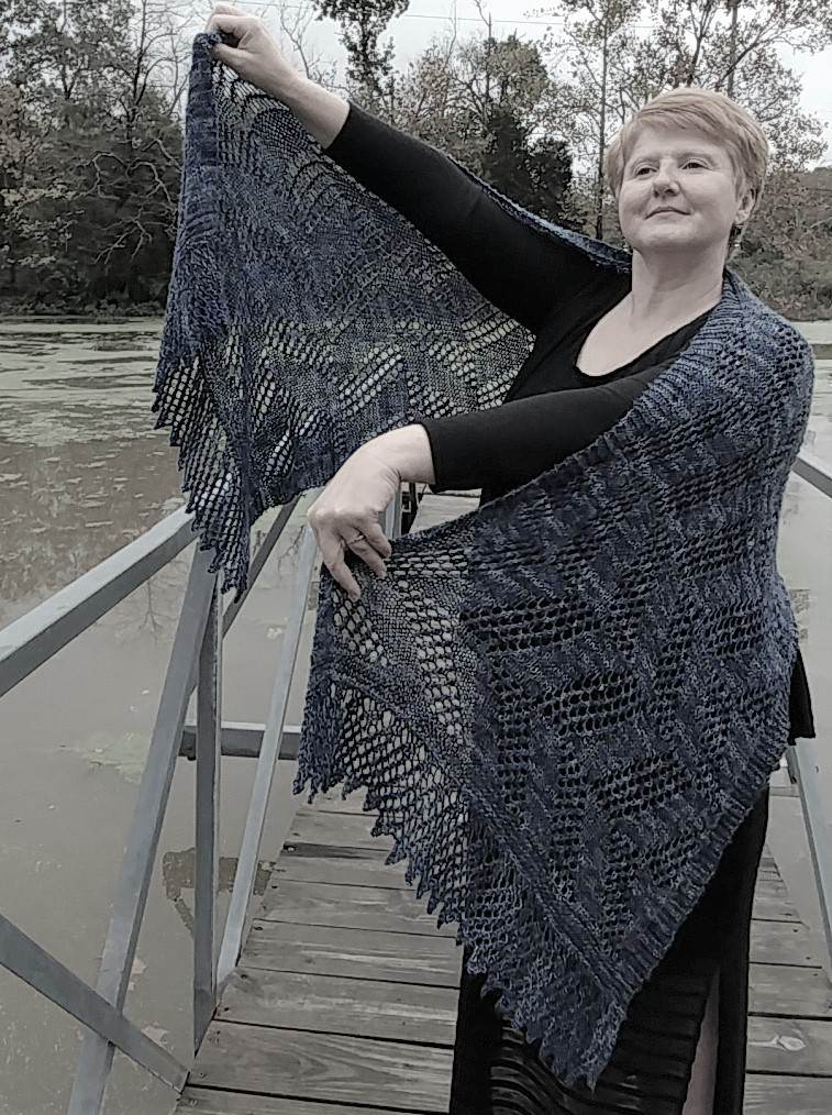 This shawl design is an homage to Poe and is based on his beautiful musical poem of the same name. The lace pattern is a study in negative space and motion. The solid rectangles represent caskets and the decreases flow in different directions to give the piece the feel of an angry ocean.