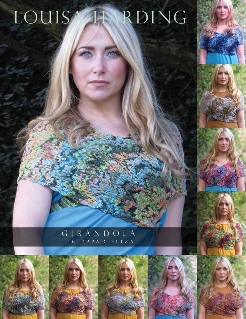 This design is featured in Girandola - Eliza Wrap, a leaflet from Louisa Harding, and uses Louisa Harding yarn including Girandola