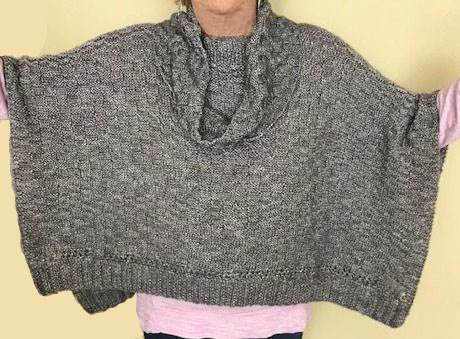 Grab a drink and start to knit. An over sized poncho with an optional detached cowl. A great layering piece and great travel accessory since it folds flat and would be wonderful on a plane or tucked into a bag if you might need another layer. Just enough pattern to hold your interest but simple enough to remember and knit on the go. The Cowl Collar is knit separately to give you choices to wear separately or together. The fabric although held double is very lightweight and the beautiful sheen of the Air Lux yarn makes this special poncho perfect to pair with your jeans or if you are out for the evening. The yardage given makes both the poncho and the cowl.