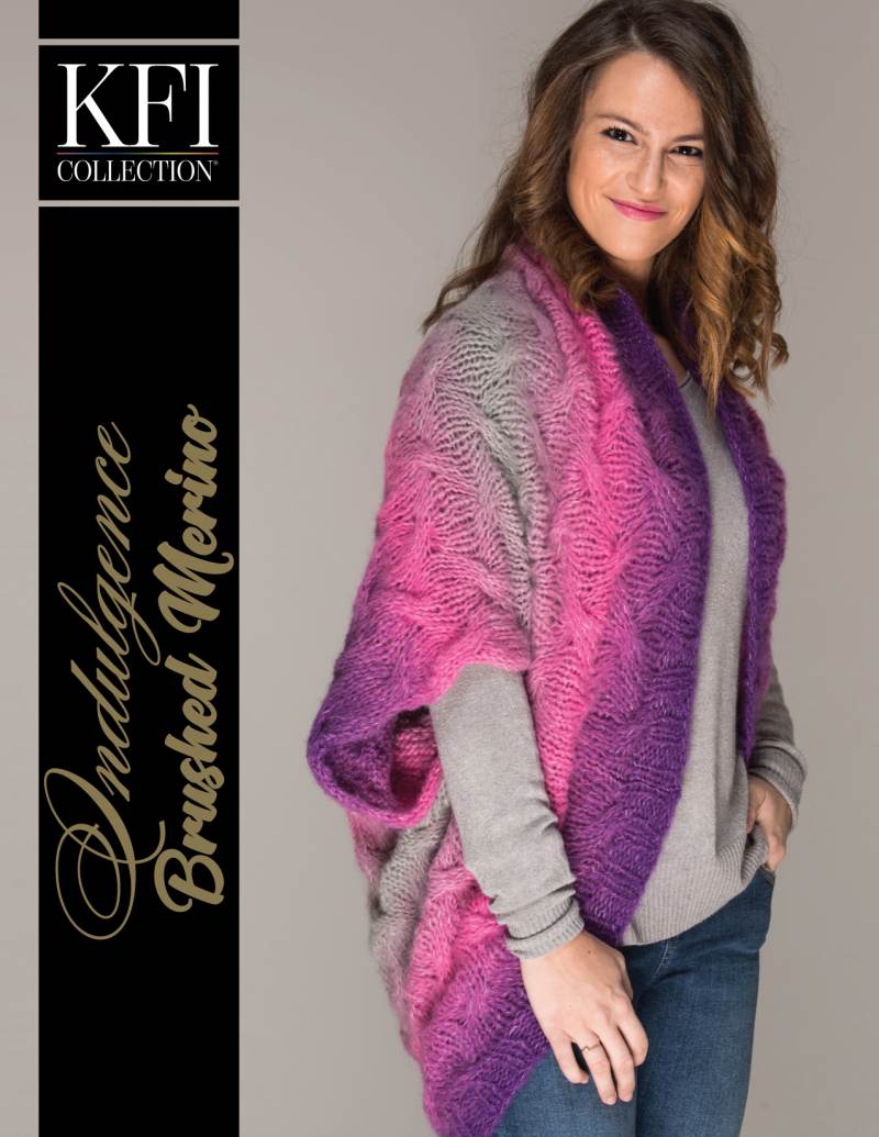 This design is featured in Indulgence Brushed Merino - kimono, a leaflet from KFI Collection, and uses KFI Collection yarn including Indulgence Brushed Merino