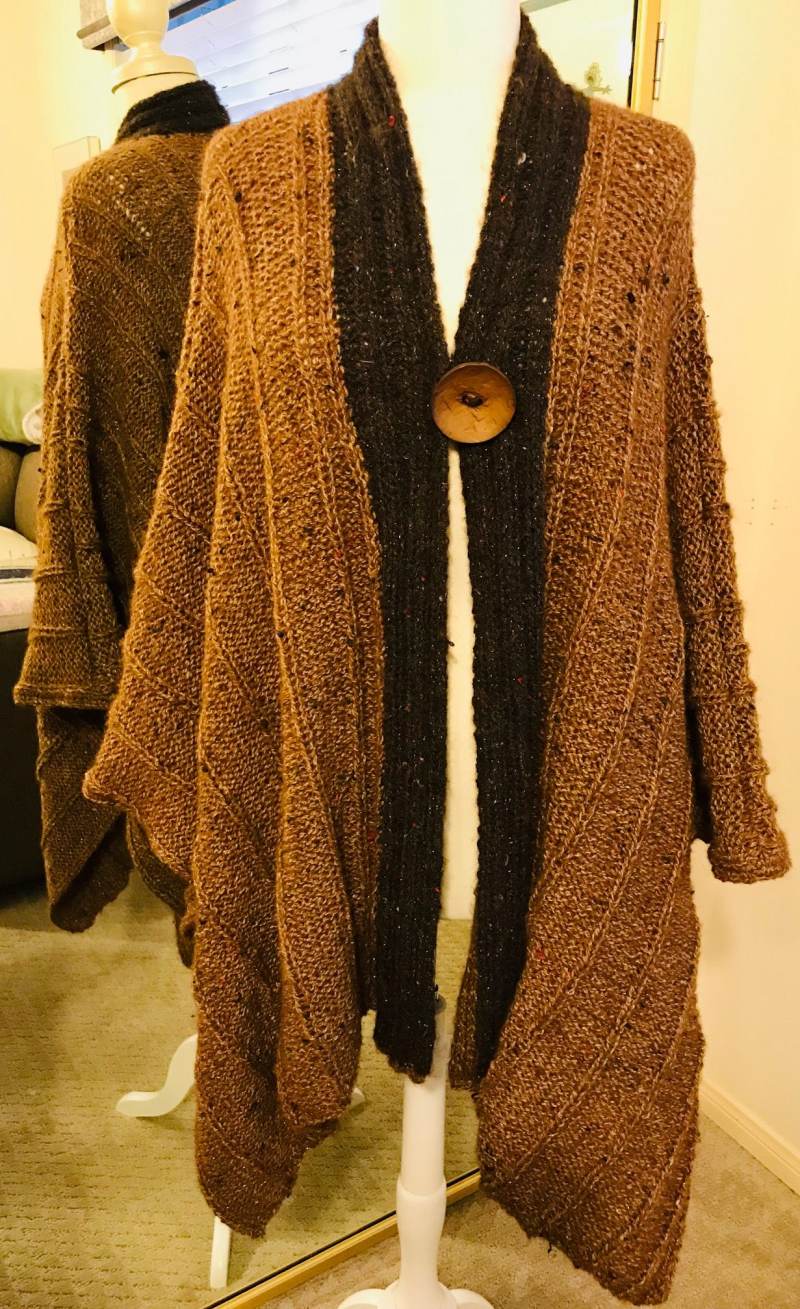 Picture yourself sitting at a small cafe with a cup of coffee. An over sized Ruana, the perfect blanket wrap to keep you warm. This very easy to knit Ruana has just enough pattern to hold your interest but simple enough for an advanced beginner. The yarn with little hints of color and splashes of metallic make this special. Worked on a large needle makes the knitting go faster and adds just th right amount of drape to the fabric.