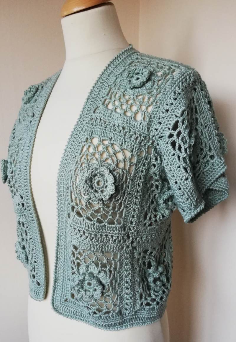 The pattern can be adjusted to create a cardigan by adding squares to lengthen bolero.