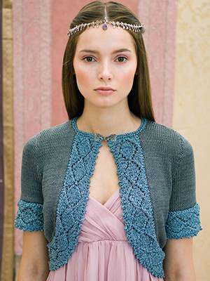 This design is featured in Rajasthan, a book from Louisa Harding, and uses Louisa Harding yarn including Glisten, and Mulberry