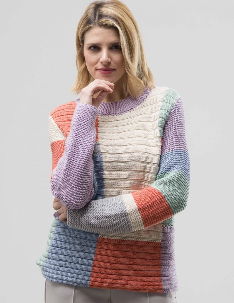 This fun pullover is knit sideways in an all-over rib pattern with intarsia color blocking. The sleeves are knit in garter stitch.