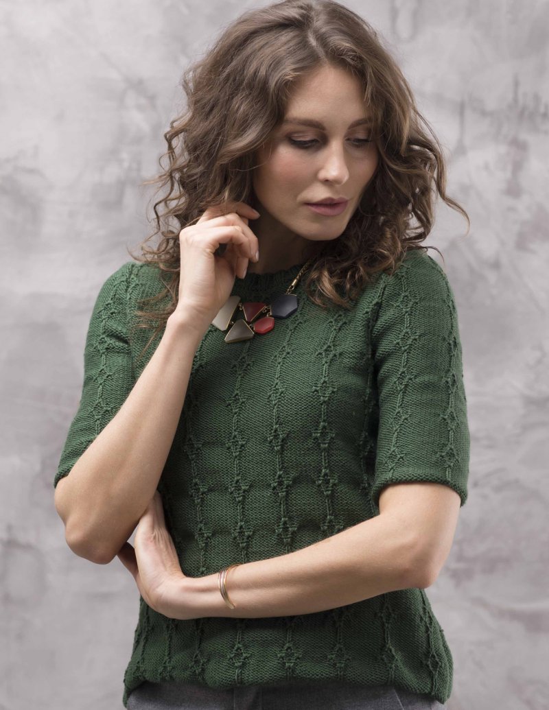 Yarn overs and dropped stitches form a unique pattern on this pretty pullover. The structure is text, but the pattern stitch is in chart form only.
