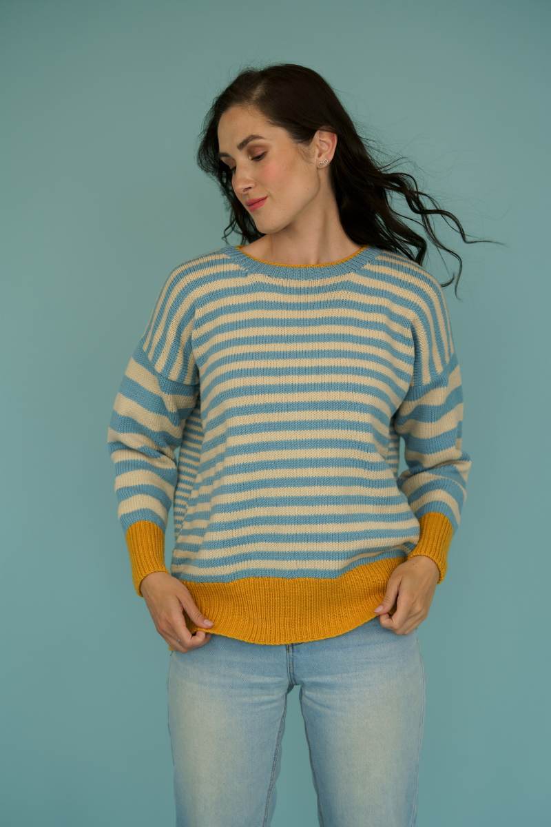 BEVERLEY mixes stripes to create a cosy and comfortable “weekend” sweater. There are 2 row stripes on the back, 4 row stripes on the front, and 8 row stripes on the sleeves. Team this with bold contrasting ribs – and contrast tipping on the neckband – and this is a sweater that will soon become a firm favourite.