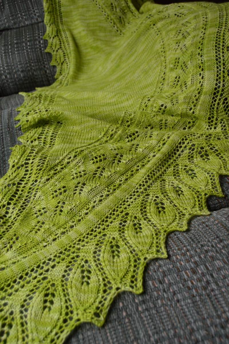Three different lace leaf patterns make the foundation of this shawl. Knit in1 piece, sideways, from end to end. The leaves on the lower edge are each accented with glass beads. ( Optional. )