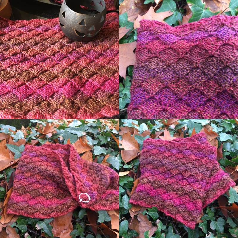 The texture of the stitch pattern, which is derived from trellis stitch, combines well with the long gradient colour changes in Painted Desert to create the impression of dragons skin.