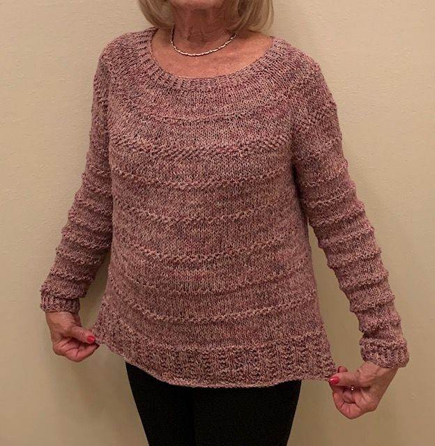 A slightly over sized pullover knit in the round from the top down with yarn held double throughout. This is a simple knit that has textured stripes to move this from the basic to something just a bit more interesting. Short rows are used to shape the back neck.