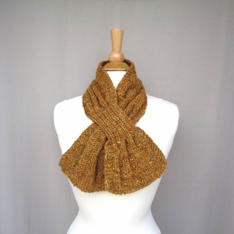 A cozy, face framing style, this keyhole scarf features a bold texture in a rustic tweed yarn.