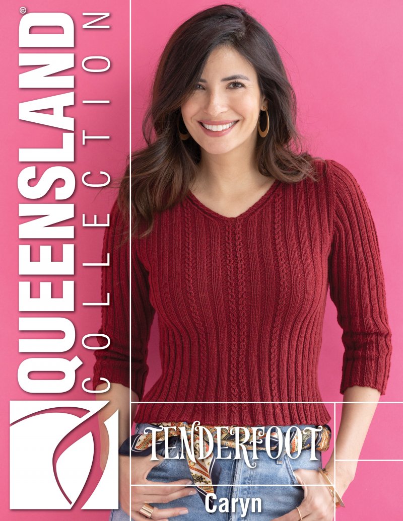 An all-over rib pattern is punctuated by baby cables. The front cables split and continue along the edge of the v-neck.