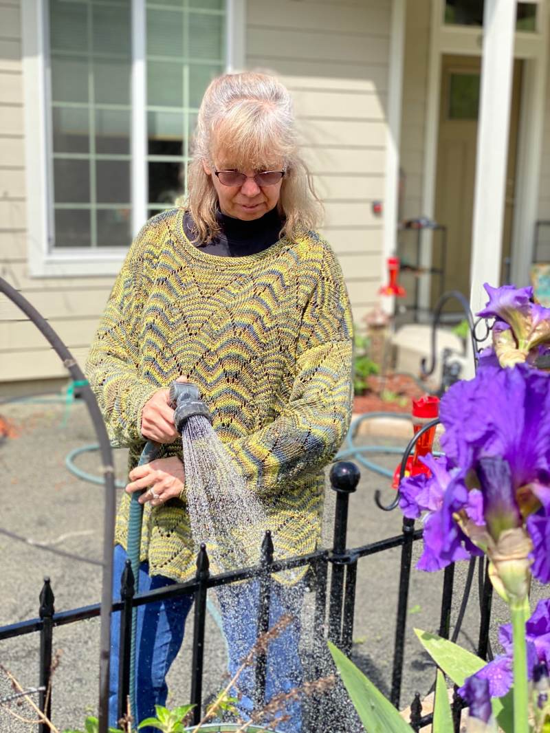 This lovely Wave lace pattern is easy to memorize and knit. The pullover is oversized and cotton is perfect for the changing weather and cool evenings!