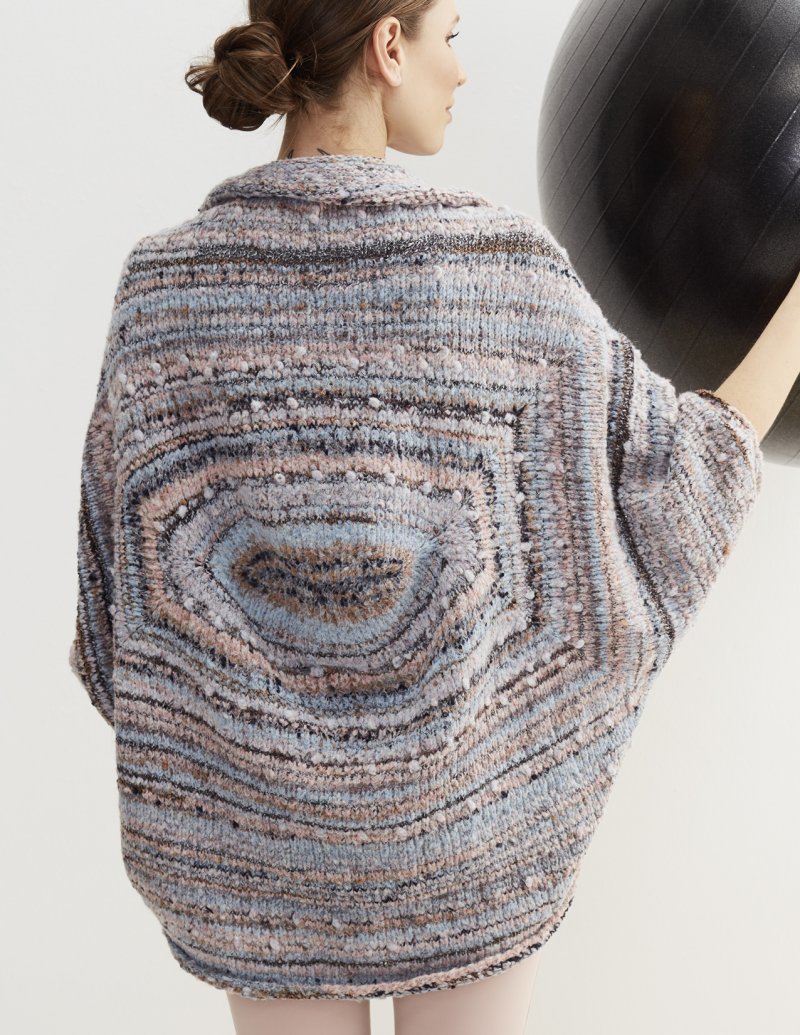 This unique cardigan is knit in the round from the center out. Sleeves are formed during the finishing process.