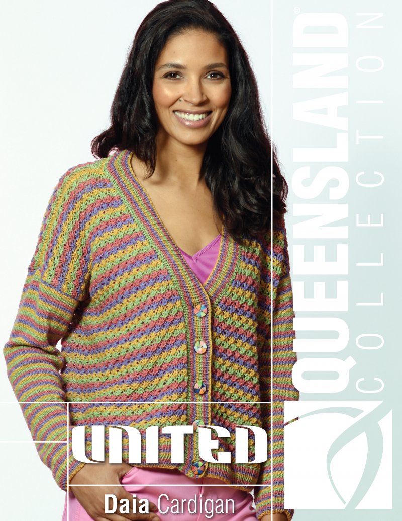 The body of this colorful cardigan features an all-over star stitch patterns. The stockinette stitch sleeves are knit in coordinated stripes.