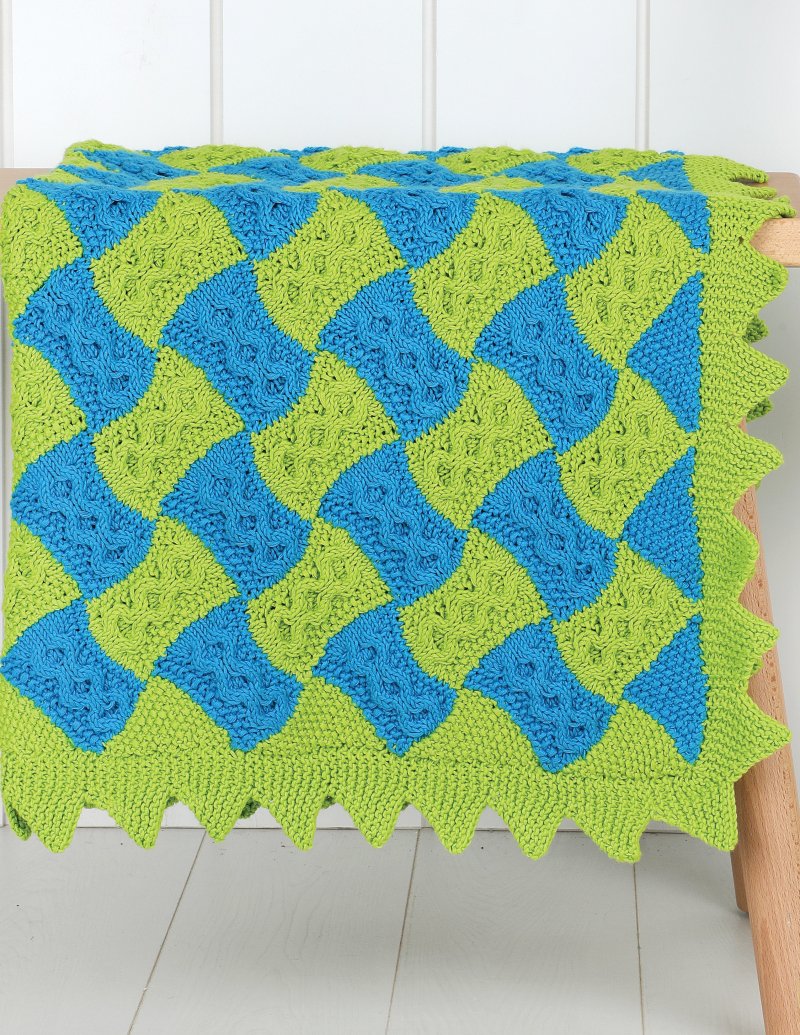 Cables dance across an entrelac base. Text only.