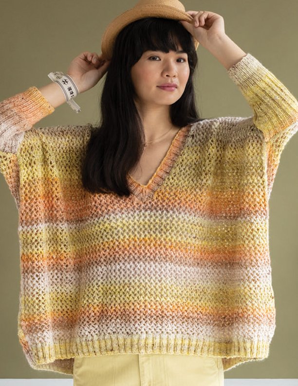 This oversized pullover features ultra-modern shaping and thoughtful details. The body features and easy four-row mesh pattern, a deep v-neck, and a flattering longer, curved, back.