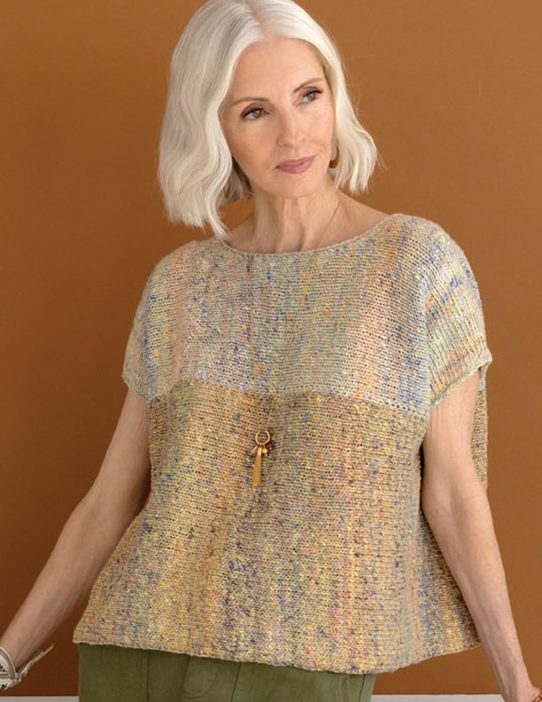 Sizing: Sized for Under RIGHT SIDE /SHOULDER SHAPING: Row 1 (RS) With A, sl 1 wyif, k50; with B, Row 2 With A, sl 1 wyif, k1, p49; with B, Next row (dec-RS) Cont in pat to marker, ssk, sm, k2, sm, k2tog, pat to end - Work 5 (7, 7, 9) rows even. Rep last 6 (8, 8, 10) rows 4 times more, then work Work 5 (5, 5, 11) rows even, end with a WS row... Under FINISHING: Using assembly diagram as a guide, fold sleeves along the dotted lines to form a triangle. Lightly tack beginning and end of cast-on row of Sleeve together and match this join to marker on side edge of front. Starting at shoulder, sew side edges of sleeve to front. Repeat for rem sleeve. Fold piece in half along shoulder line. Sew side seams, starting at lower edge and ending seam at the beginning of stitches worked with B. |