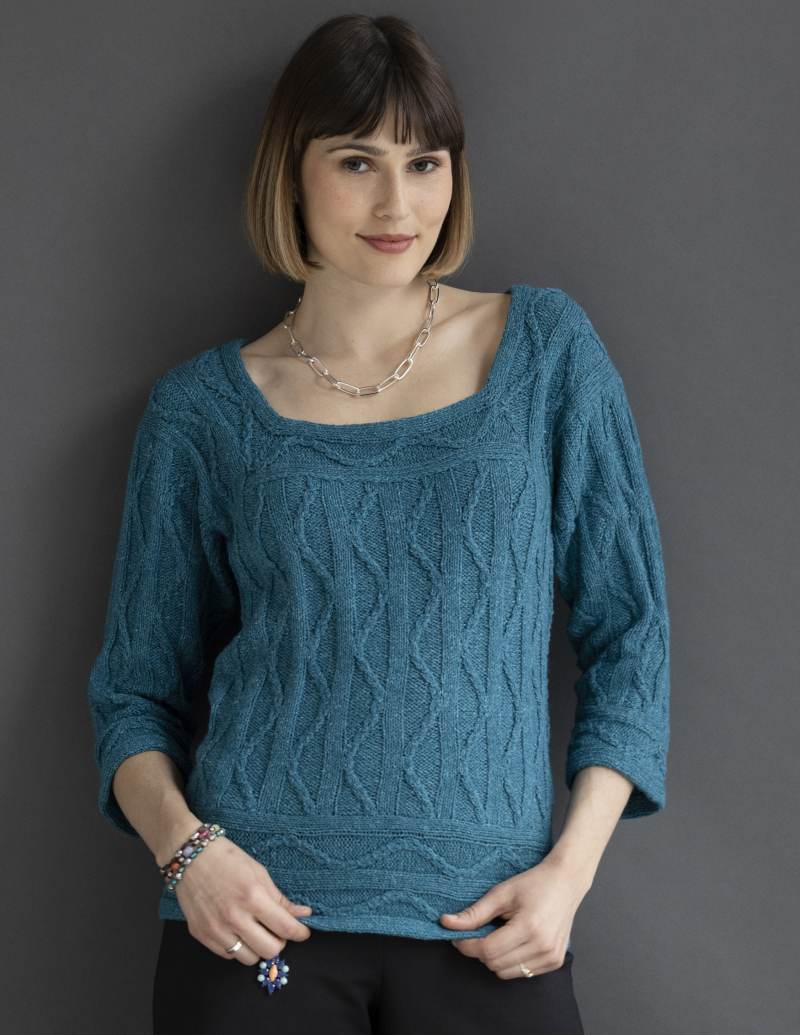 This pattern has unusual construction and advanced techniques including provisional cast on, German Short rows, and shaping in pattern. The horizontal hem band is knit first, then the body is worked in the round to the yoke.
