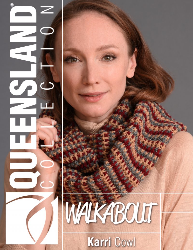 Knit flat and seamed. Three colors of Walkabout dance across this slip-stitch cowl.