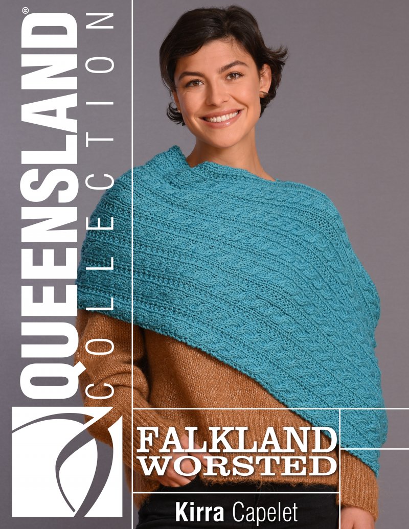 This attractive poncho features an all-over cable and rib pattern that displays the great stitch definition of Falkland Worsted yarn.
