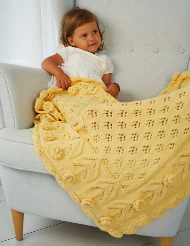 This gorgeous blanket is a tour de force of techniques. The leaf and stem detail on the border is charted. The eyelet pattern on the main body of the blanket is text. The flower buds are knit separately and sewn into place. The lace border is knit separately and sewn into place.