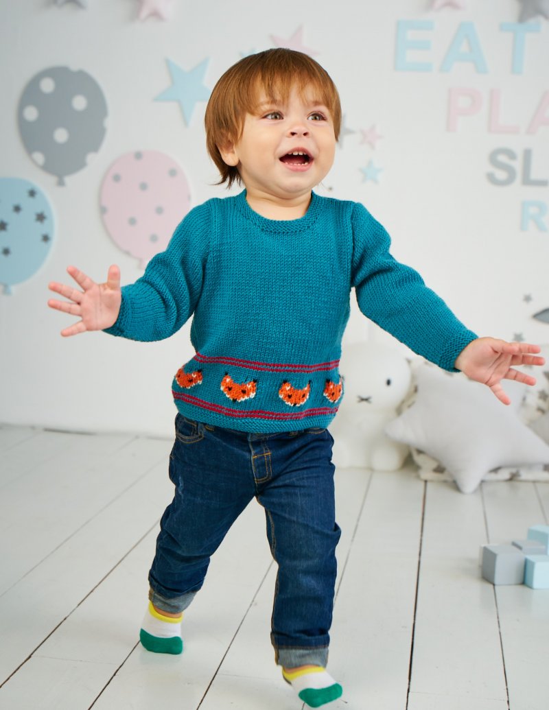 Intarsia fox faces make a border on the front and back of this adorable, unisex pullover. Buttons on the neckband help with on/off.